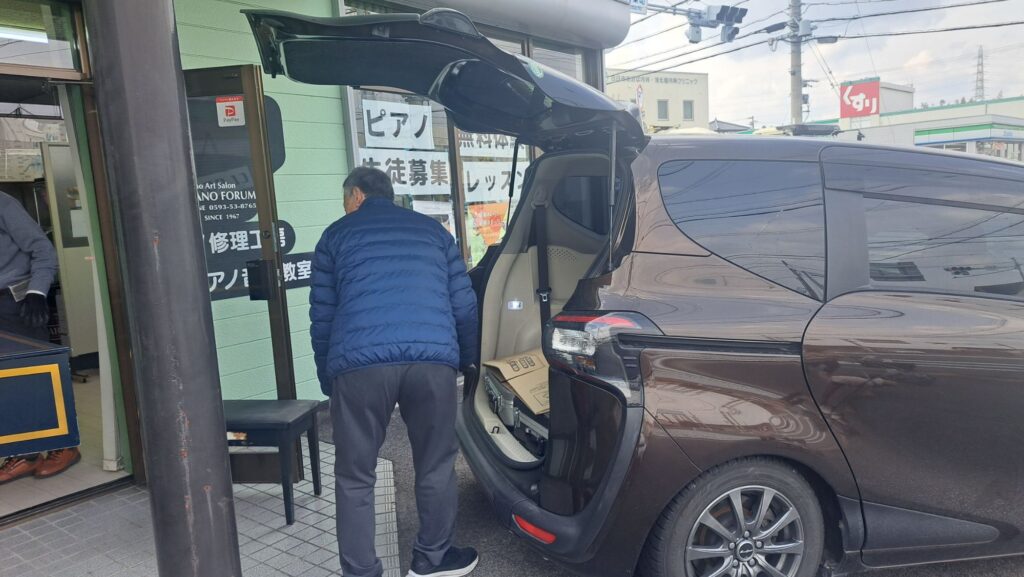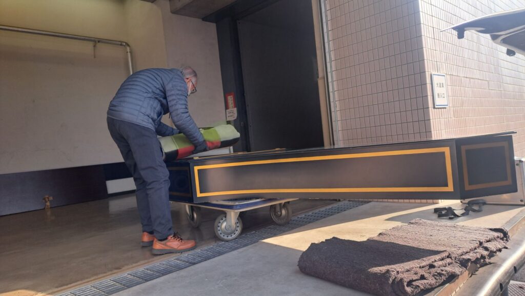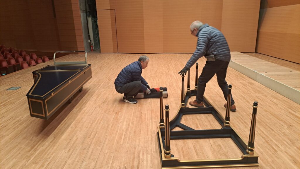 チェンバロはピアノフォーラムのものを使用します。3人がかりで積み込みします。
